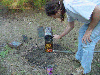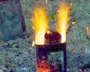 Pack dirt around the hole where the pipe enters. This seals-in most of the air. It might need to be re-packed a time or two during the burn. You might note that I forgot this step - the can is burned at the bottom. No big deal, it just blows some fire out the bottom as well as the top.