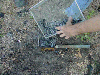 I punch a couple of holes in the bottom with a can-tap, then use a knife to enlarge the hole so that a section of iron pipe can be rammed in. The hole does not need to be air-tight around the pipe - we will compensate for leakage with dirt.