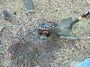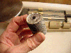 My deepest thanks Al Bradley who pointed out that the alloy used in cans is not optimal for casting, that I should find cast-aluminum and use it. Here I have broken up an old water-pump from the Toyota pickup. Looks cast to me. Indeed, this aluminum melted much more readily than the cans, and cast very nicely.