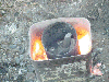 The blower starts. I like to let the coals get all lit and burned down a bit before putting in the can of aluminum.