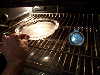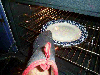 |    | Pans go into the oven, preheated to 300 degrees Farenheit (150 degrees celsuis). Please note that the color of the rear pan is an illusion: it is really clear white, not amber. This is due to the rear pan being lit more by the oven-light, the front pan lit more by the camera flash. I assure you that in real life they are the same color. The camera does lie, at least this camera. |