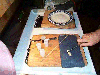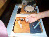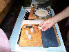 Here I am breaking off a small sample to roll into a stick.  Note the board covered in denim.  Smooth cloth makes an excellent rolling surface for this propellant.